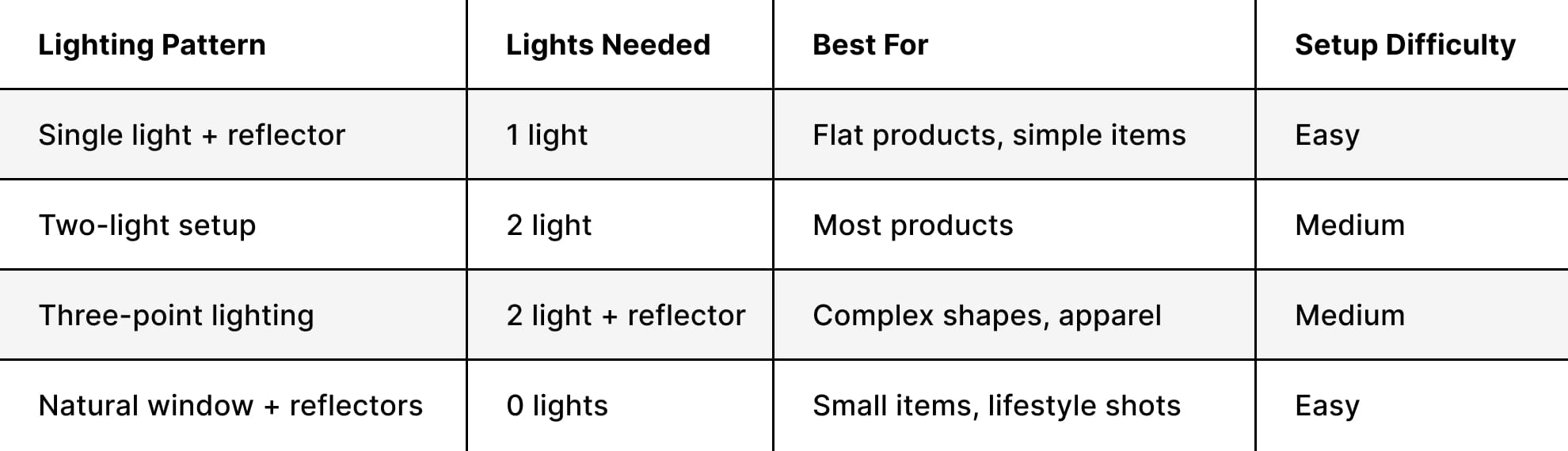 Professional photographers use specific lighting patterns to shape how products appear. These techniques work equally well with budget lights as they do with $3,000 strobes. The secret is understanding light placement and ratios.