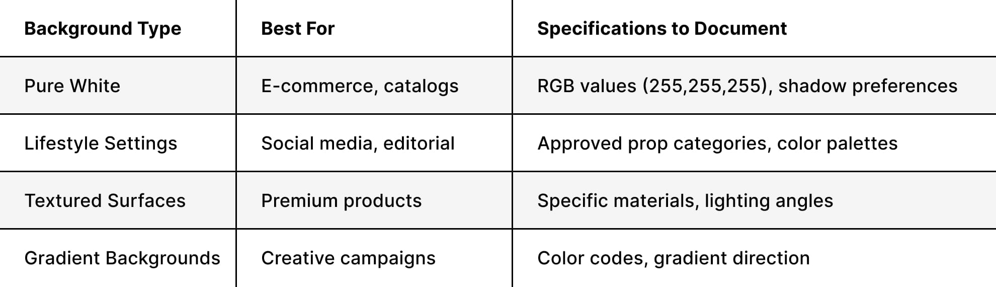 This is where your product photography style guide gets practical. Technical specs remove guesswork and enable consistent execution across different photographers, studios, and shooting sessions.